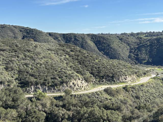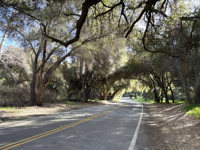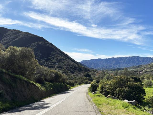 After zigzagging across the Santa Rosa Plateau of boulder-strewn and Live Oak dotted meadows, the route drops down into the canyons starting on Los Gatos Road where you see views of the lower elevations of the Santa Ana Mountains. The route undulates up and down on Carancho Road but then slots into a canyon and heads due south once you turn onto De Luz Road and follows its random squiggles with overhanging tree tunnels and multiple possible water crossings. You’ll not need to worry about any water or slippery slime most of the year but be cautious if there has been recent rain and heed the warnings to not cross if it’s deeper and fast running.